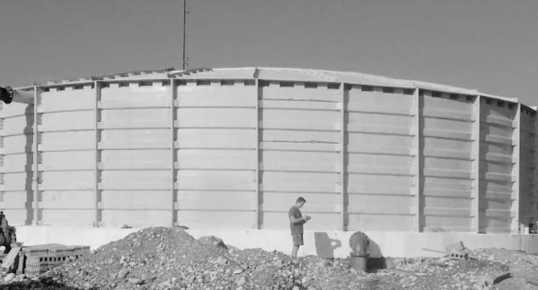 Los tanques están formados por placas verticales y rectangulares nervados con una base y coronación que le refiere estabilidad. Su fijación al suelo no es solo por medio de tornillería sino que el fondo está realizado con el mismo material (PRFV) soldado a las placas verticales así quedando totalmente estanco sin juntas.
